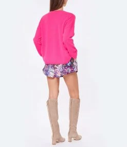 Pull en cachemire rose fluo. Col en V. Manches longues. Coupe droite. Base droite.