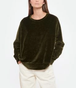 Pull en velours de coton mélangé vert. Col rond. Manches longues. Coupe droite. Base droite.