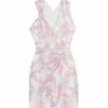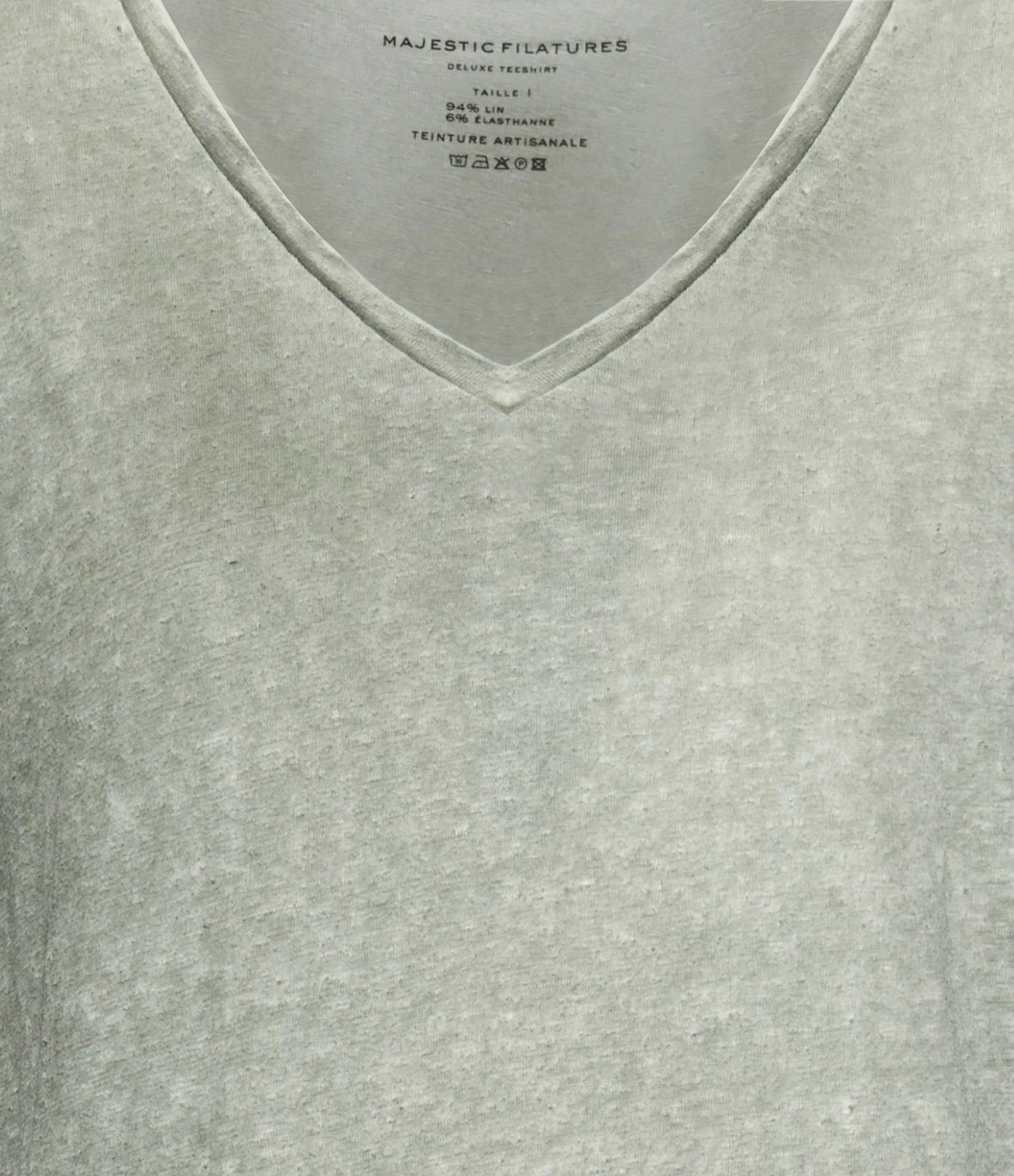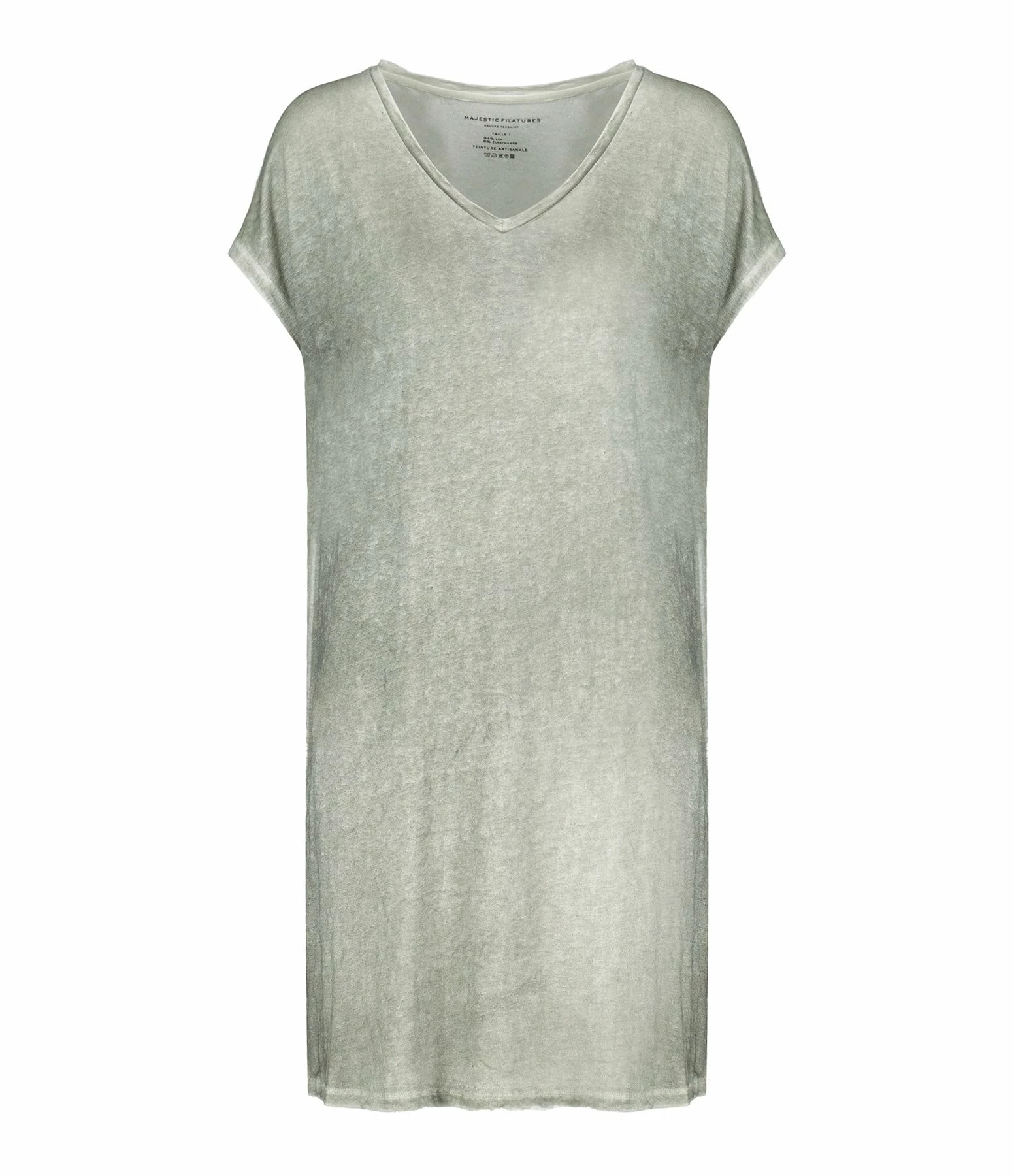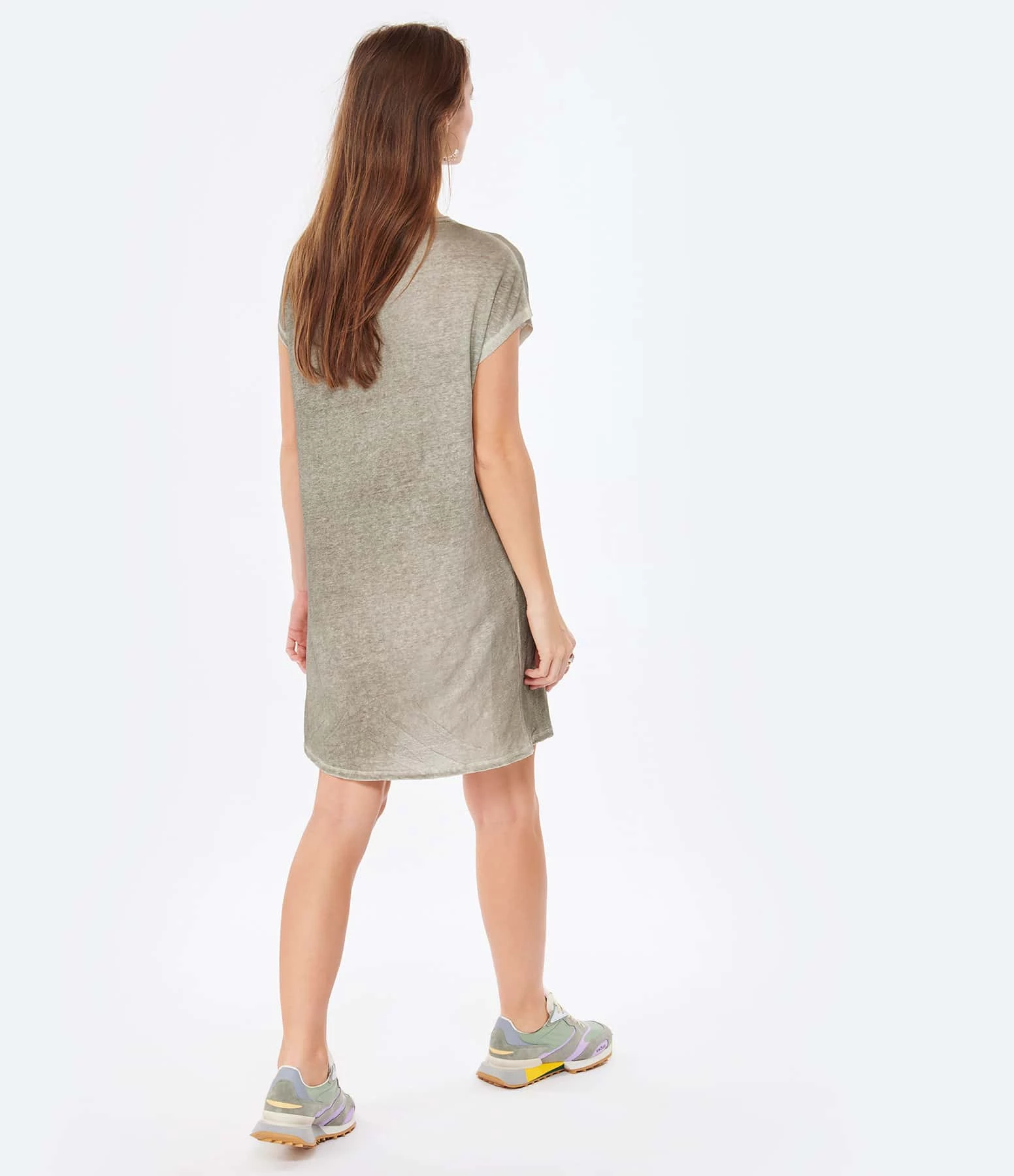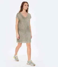 Robe courte en lin kaki. Manches courtes. Col en V. Coupe droite. Base droite.