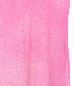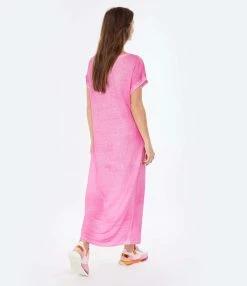 Robe longue en lin rose. Manches courtes. Col en V. Coupe droite. Base droite.
