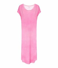 Robe longue en lin rose. Manches courtes. Col en V. Coupe droite. Base droite.