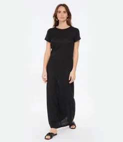 Robe longue en lin noir. Dos nu plongeant en V. Manches courtes. Coupe droite. Base droite.