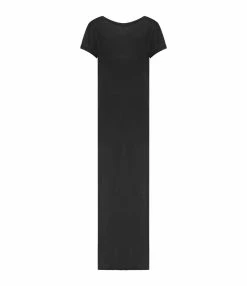 Robe longue en lin noir. Dos nu plongeant en V. Manches courtes. Coupe droite. Base droite.