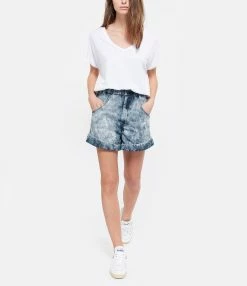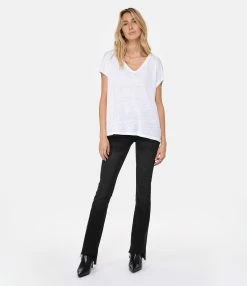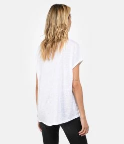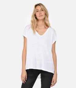 Tee-shirt manches courtes en lin blanc. Coupe large. Col en V. Base droite légèrement plus longue à l’arrière.