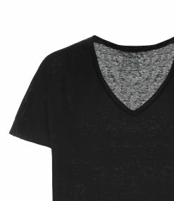 Tee-shirt manches courtes en lin noir. Coupe large. Col en V. Base droite légèrement plus longue à l’arrière.