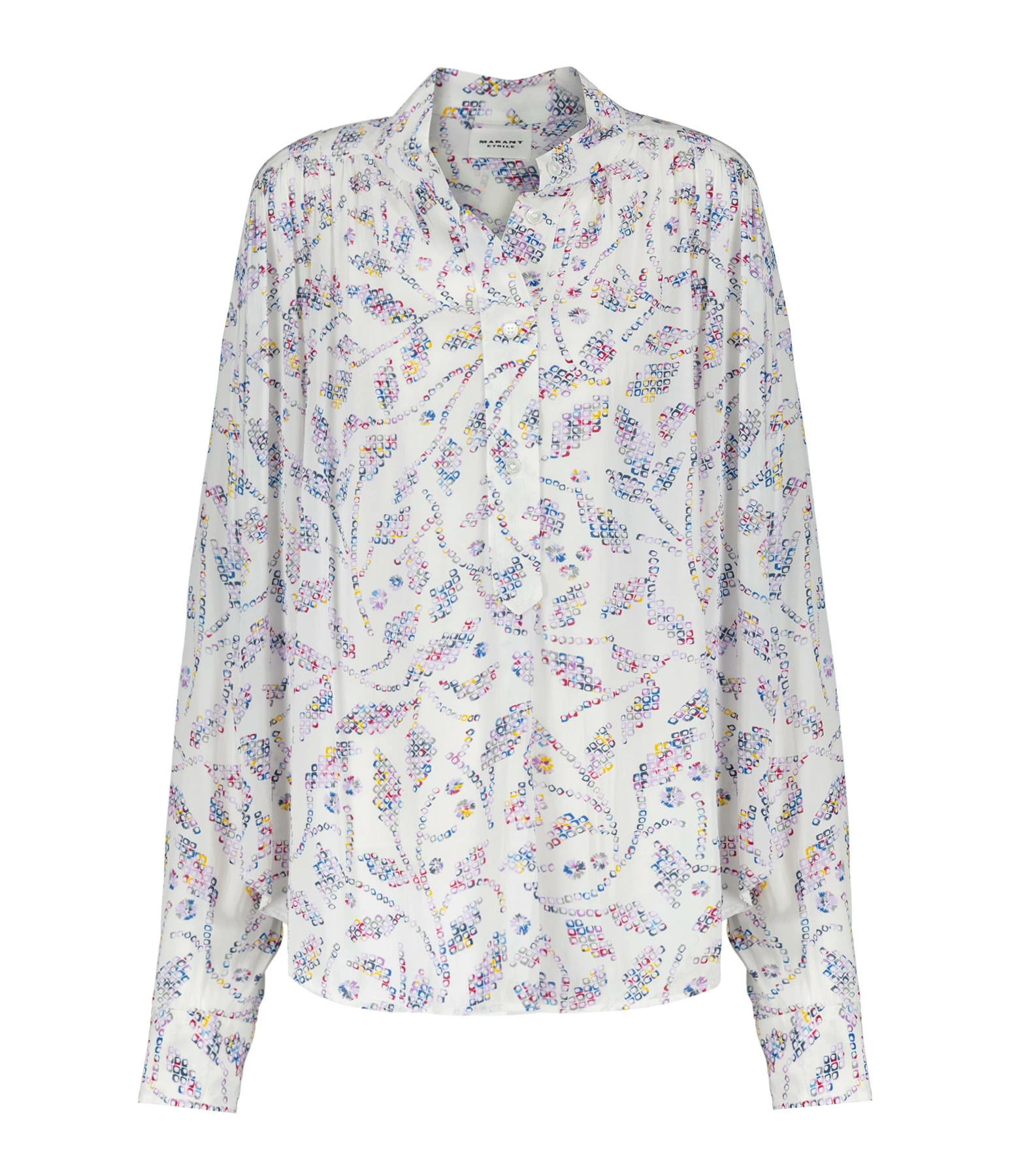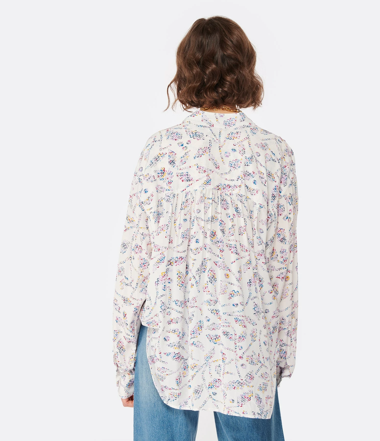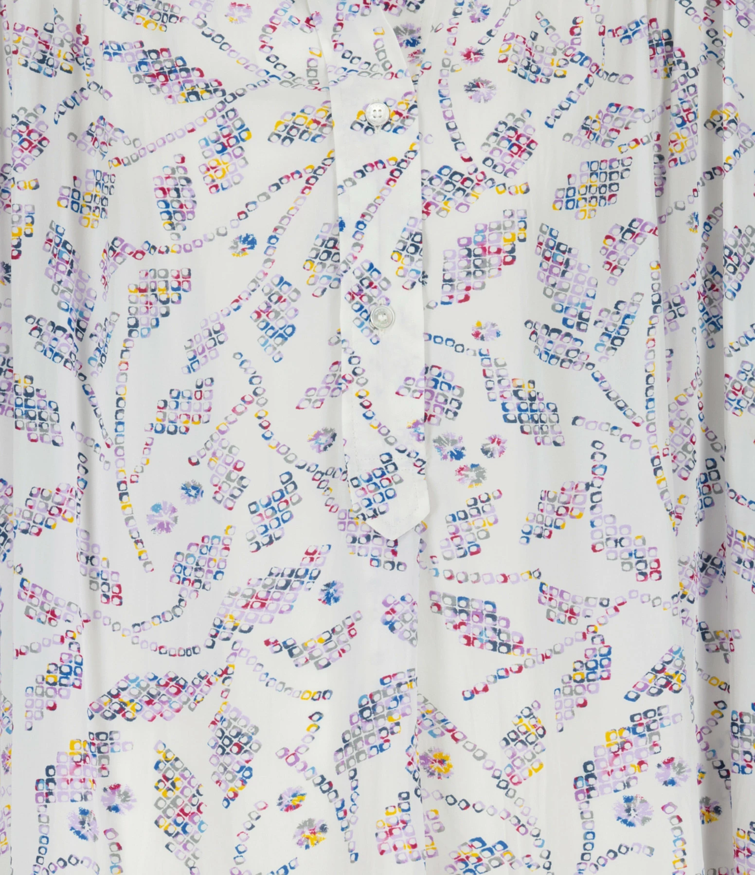 Blouse blanche à motifs géométriques multicolores ornée de fronces. Col montant. Épaules froncées. Manches longues avec fentes et poignets boutonnés. Demi-patte boutonnée sur le devant. Petits boutons nacrés. Dos froncé. Coupe ample. Longueur plus courte sur le devant que dans le dos. Base arrondie.