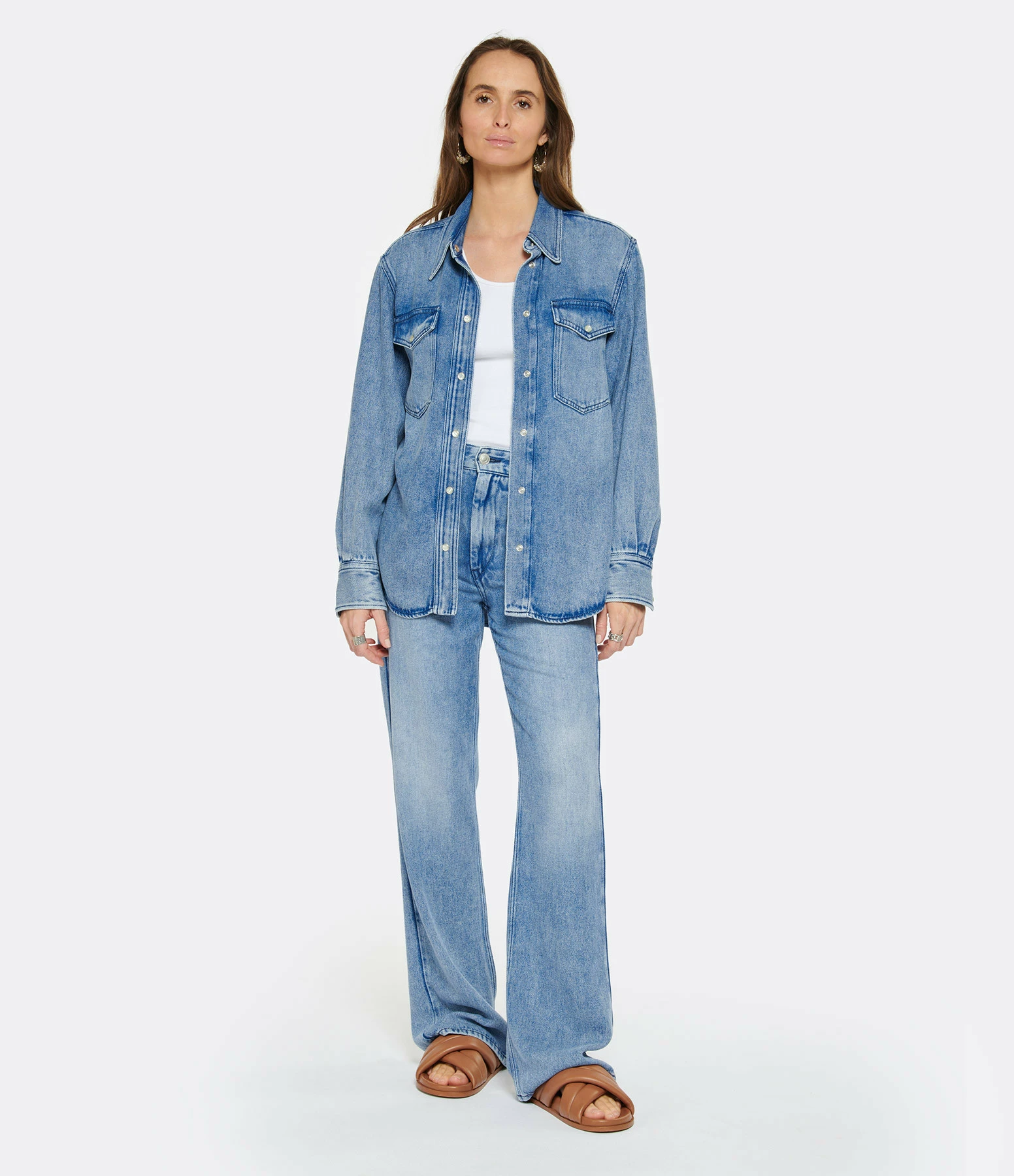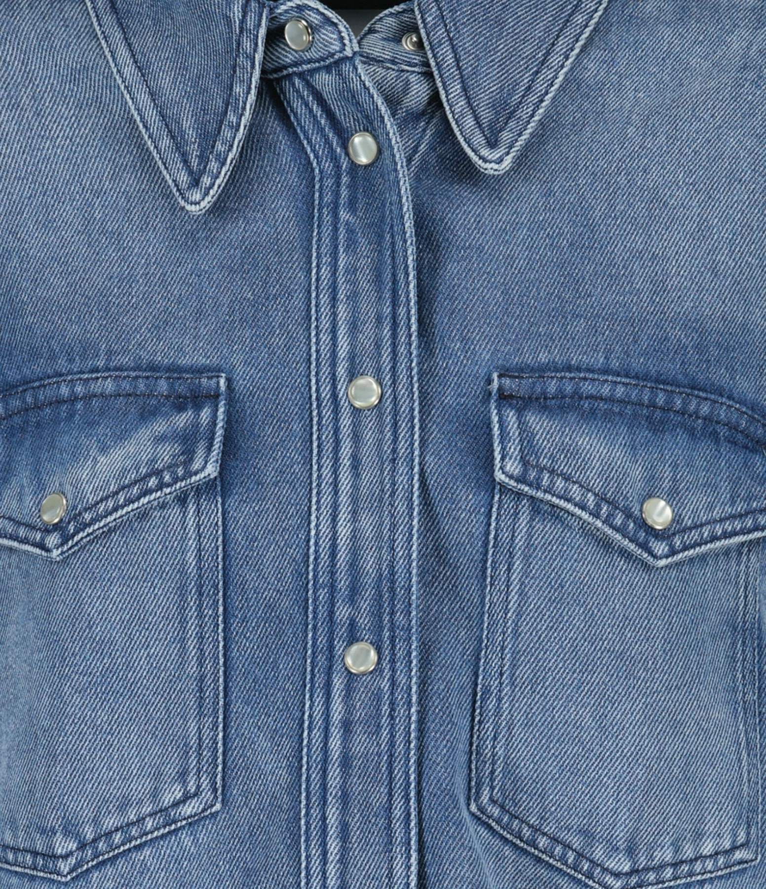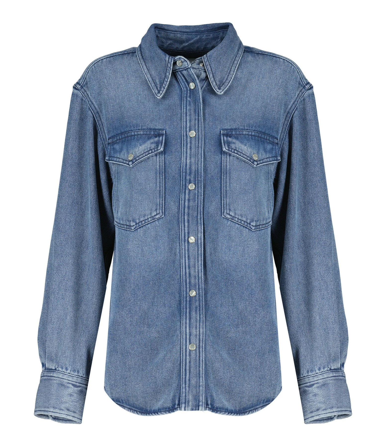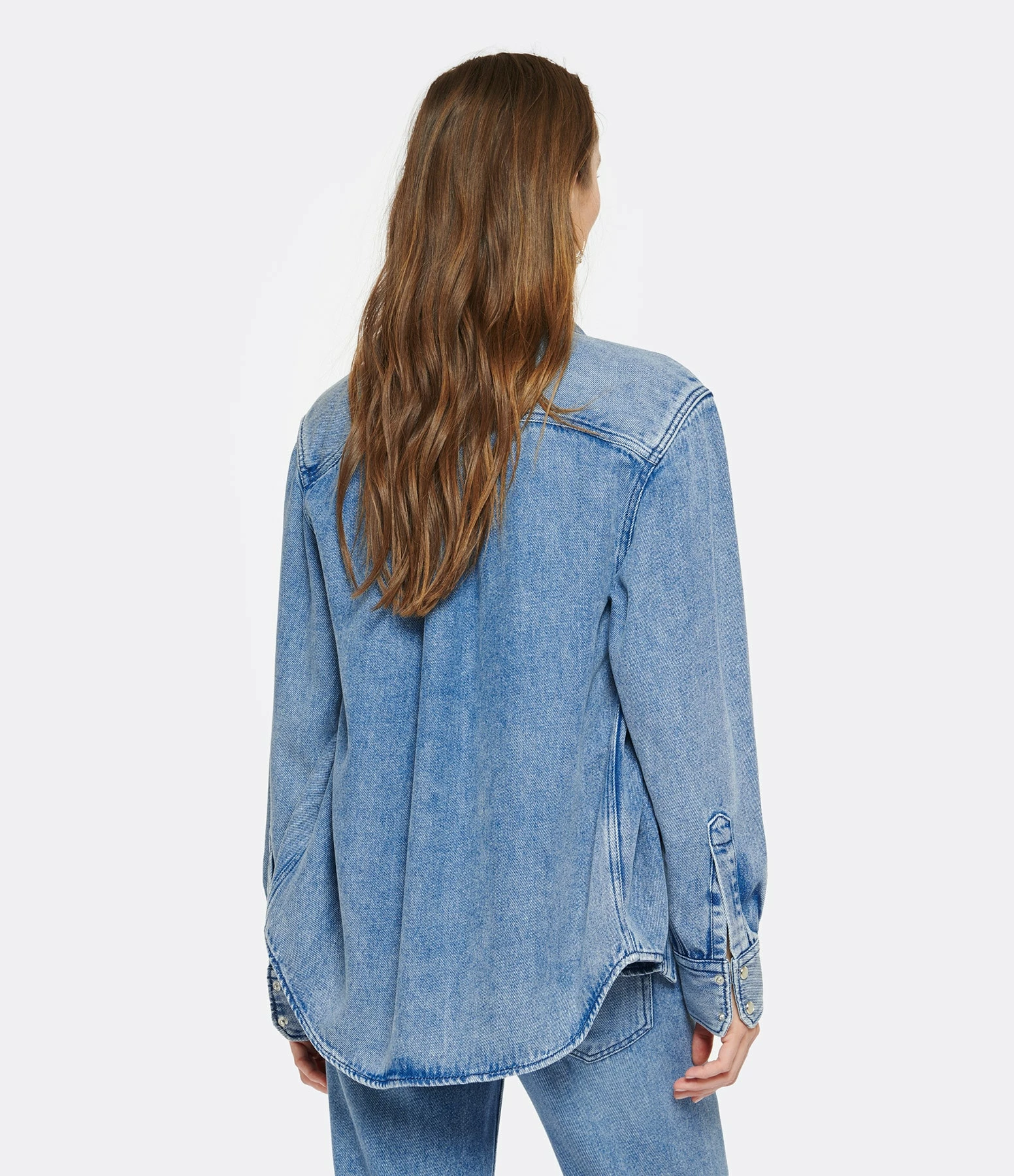Chemise en denim bleu clair. Col chemisier. Manches longues avec fentes et poignets pressionnés. Fermeture pressionnée sur le devant. Deux poches à rabat pressionnée. Petits boutons nacrés. Fentes latérales. Coupe droite. Base arrondie.