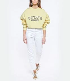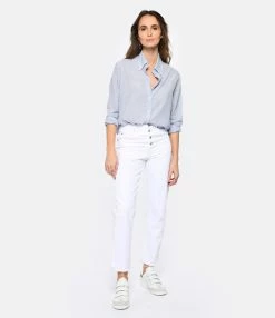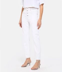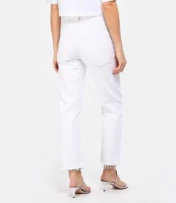 Jean droit en denim blanc. Taille haute. Fermeture boutonnée. Cinq poches. Coupe droite. Bas de jambe coupé à cru effiloché.