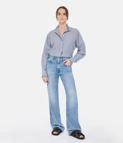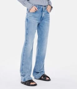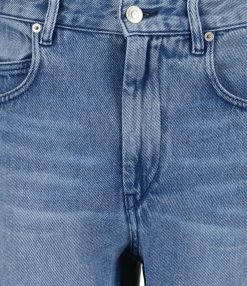 Pantalon large en denim de coton bleu clair. Taille avec passants pour ceinture. Braguette zippée et bouton. Bouton métallique argenté avec logo. Deux poches italiennes et une poche à gousset. Deux poches plaquées dans le dos. Coupe droite. Base droite.