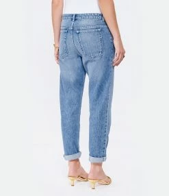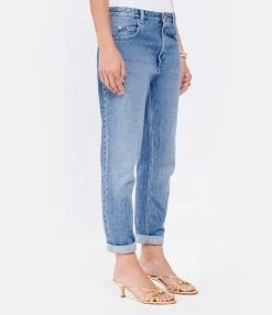 Pantalon en denim de coton bleu. Cinq poches. Taille mi- haute. Fermeture par zip et boutons. Passants pour ceinture. Coupe droite.