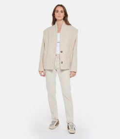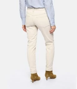 Pantalon en denim de coton écru. Passants pour ceinture. Braguette zippée et bouton métallique argenté. Deux poches italiennes. Deux poches plaquées dans le dos. Coupe droite. Base droite coupée à cru.