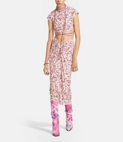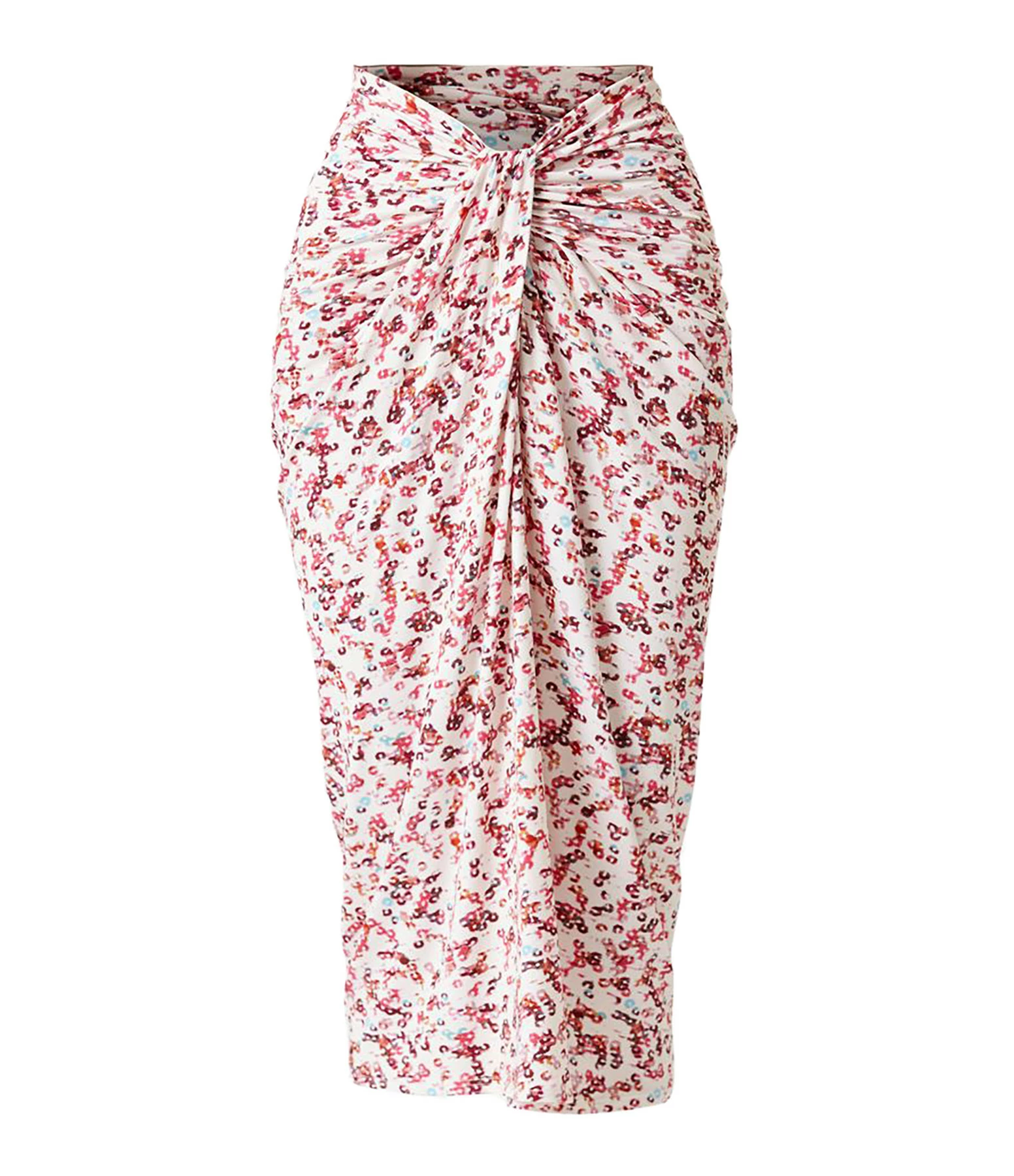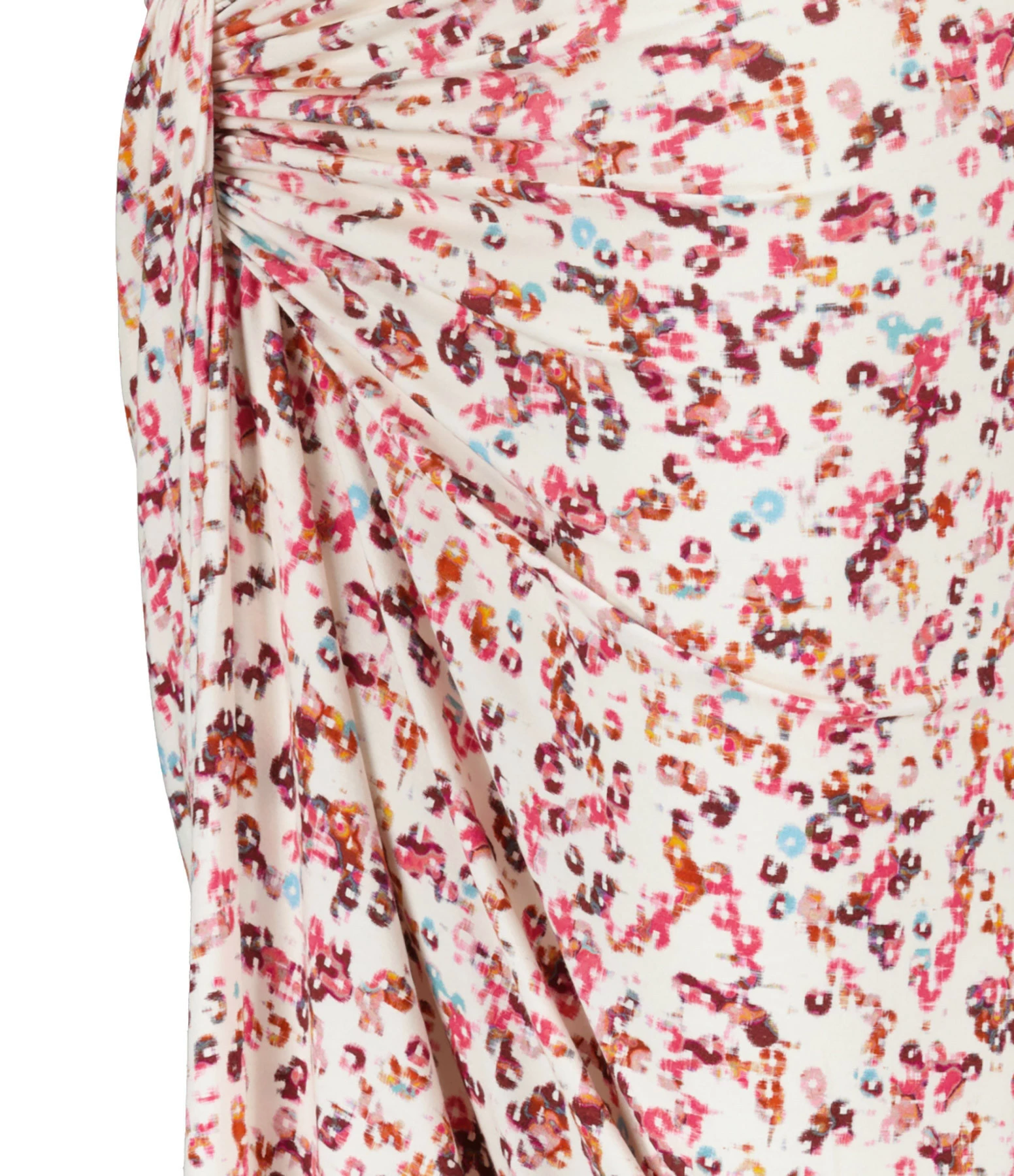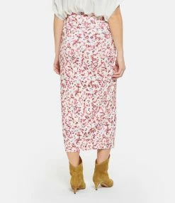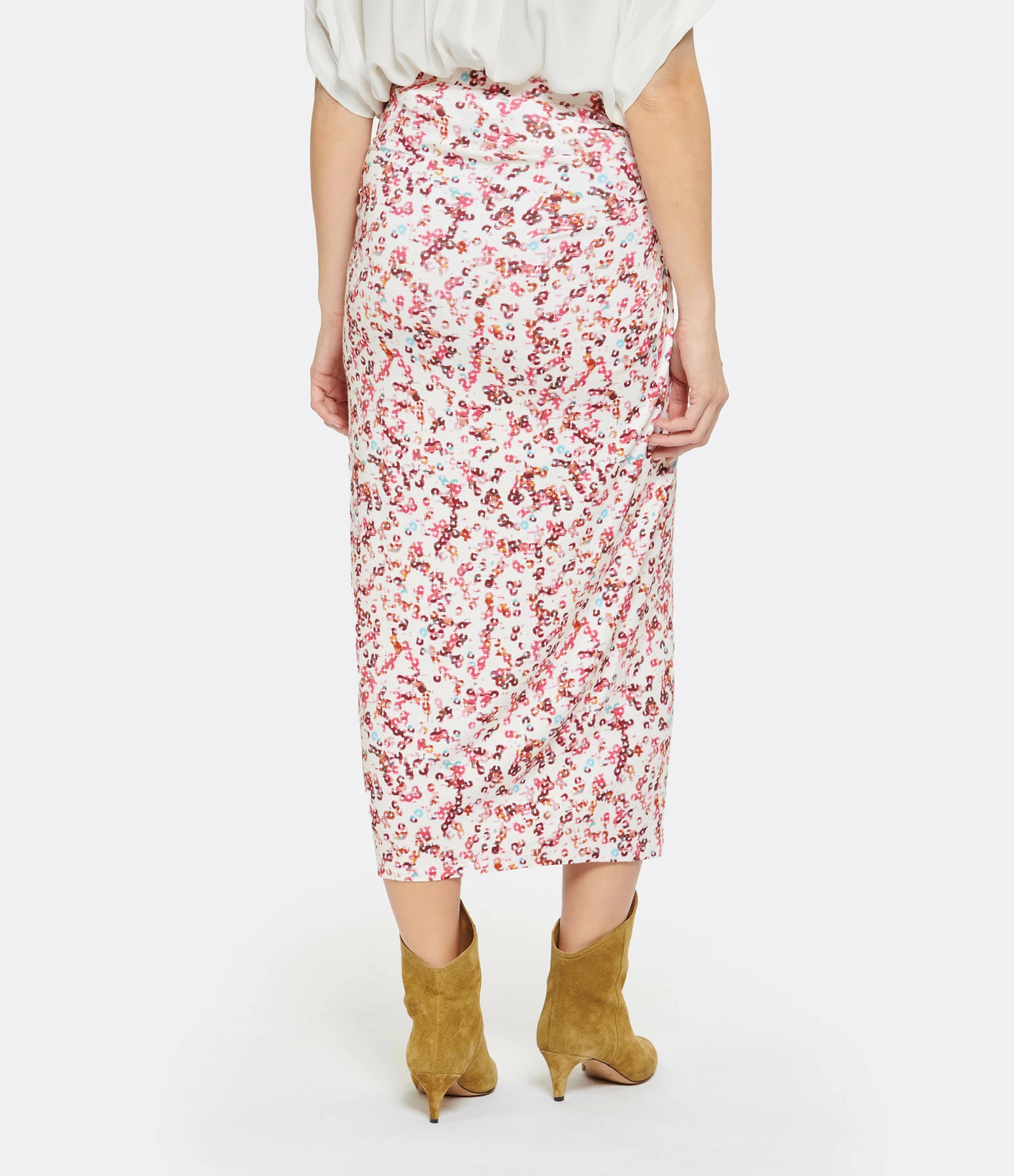 Jupe midi froncée écru orné d’un imprimé dans des tons roses. Coupe droite. Base droite.