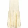 Jupe midi en denim bleu clair. Fermeture zippée et boutonnée. Deux poches italiennes et une poche à gousset. Deux poches plaquées sur le dos. Fente d’aisance milieu devant. Découpe milieu dos. Ceinture montée avec passants. Coupe droite. Base droite. Rivets métalliques argentés. Doublée en coton.