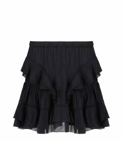 Jupe courte en coton noir ornée de fronces et de volants. Taille élastiquée. Coupe évasée. Base à volants.