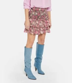 Jupe courte à volants en coton fleuri dans les tons roses. Taille smockée et élastiquée. Coupe évasée. Volants sur le bas de la jupe. Doublée.