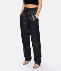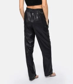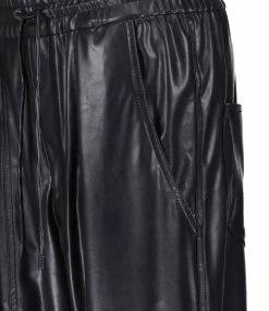 Pantalon en simili cuir noir. Taille froncée et élastiquée avec liens de serrage à nouer. Braguette zippée. Deux poches italiennes. Deux poches plaquées dans le dos. Coupe droite. Base droite. Doublé.