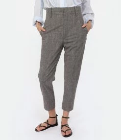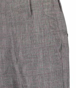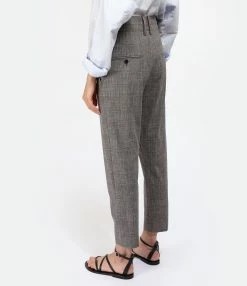 Pantalon à pinces en laine à carreaux noir et rose. Taille haute. Fermeture par zip et agrafe. Deux poches avant et deux poches arrière plaquées boutonnées. Coupe slim.