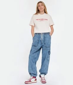 Pantalon en coton denim bleu délavé. Deux poches italiennes à l’avant. Deux poches à rabats fermées par boutons au niveau des jambes. Deux poches plaquées à l’arrière. Taille élastiquée avec cordon de serrage. Coupe droite.