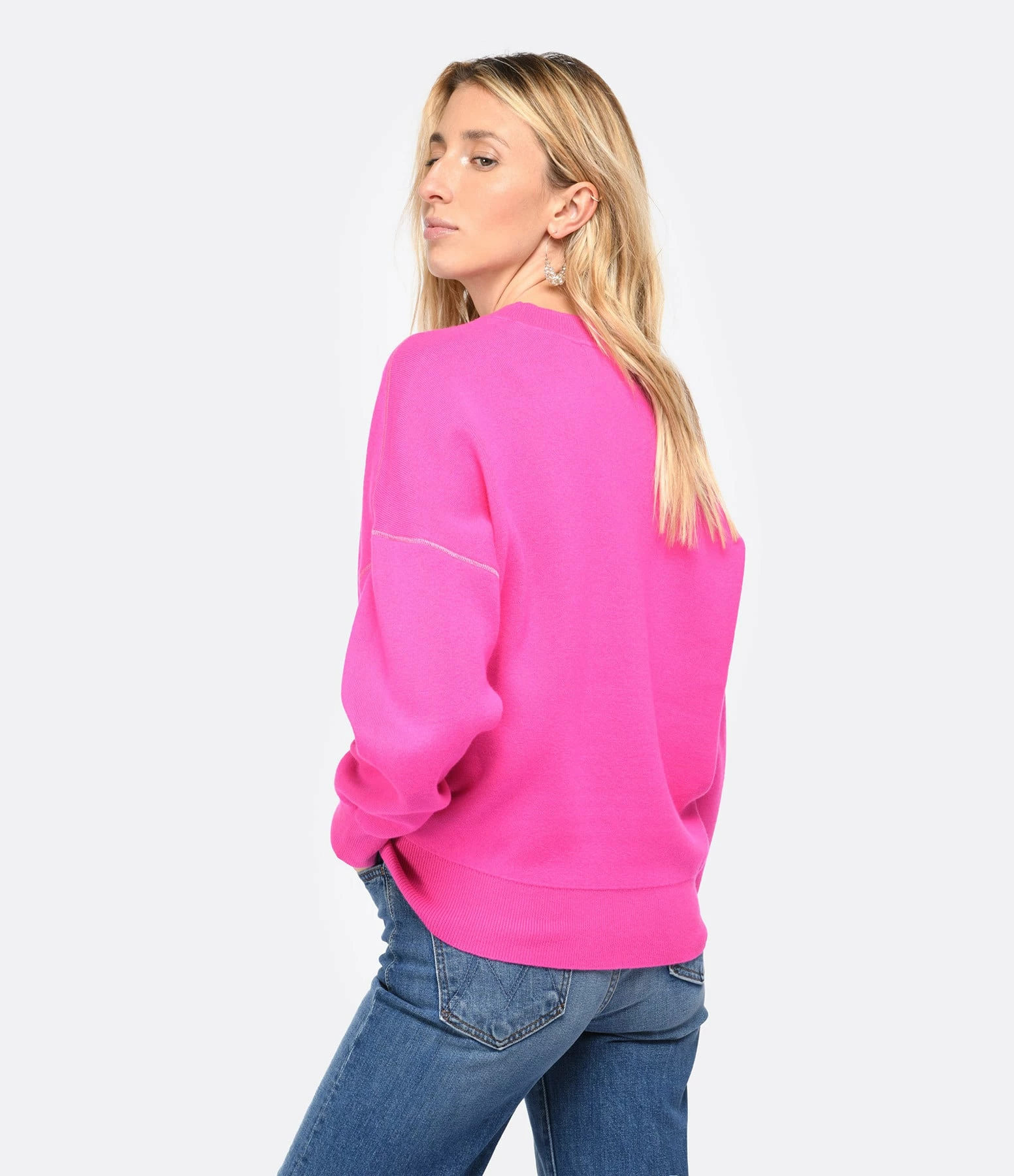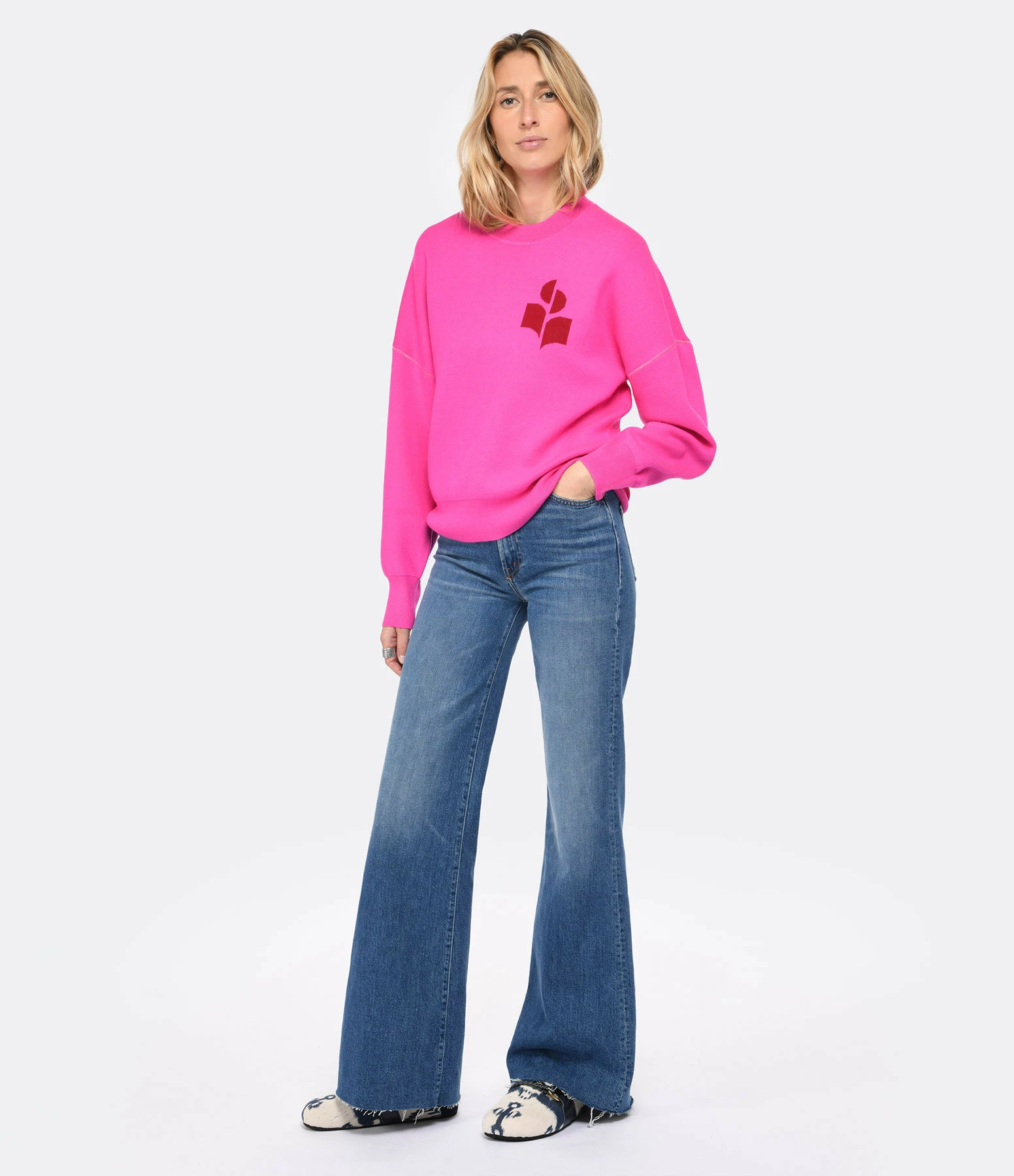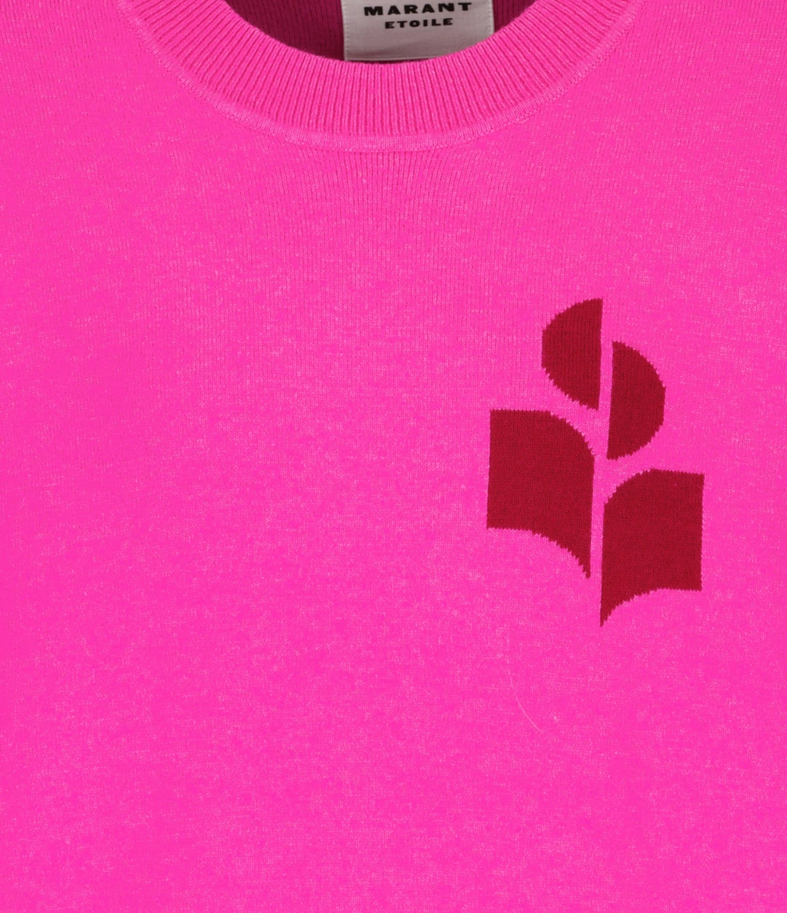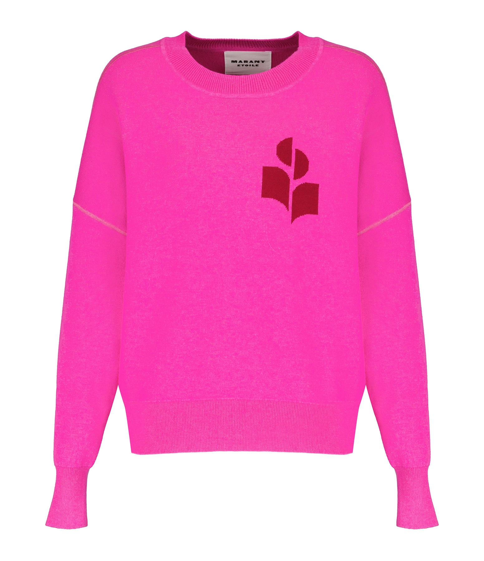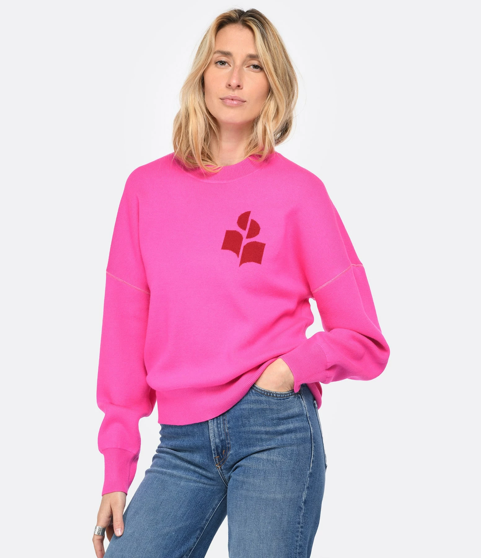 Pull en coton et laine rose. Logo imprimé en bordeaux sur la poitrine. Col rond côtelé. Manches longues avec poignet côtelé. Coupe droite large. Base droite côtelée.