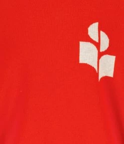 Pull en coton et laine rouge vermillon. Logo imprimé en écru et gris clair sur la poitrine. Col rond côtelé. Manches longues avec poignet côtelé. Coupe droite large. Base droite côtelée.