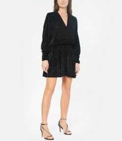 Robe courte en velours noir ornée de fils métallisés argentés. Col en V. Épaulettes. Manches longues avec fentes et poignets boutonnés. Fermeture zippée invisible latérale. Taille froncée. Coupe buste droite. Coupe jupe évasée. Base droite. Doublée.