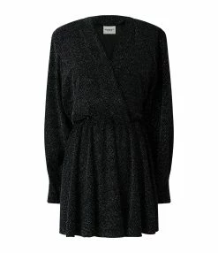 Robe courte en velours noir ornée de fils métallisés argentés. Col en V. Épaulettes. Manches longues avec fentes et poignets boutonnés. Fermeture zippée invisible latérale. Taille froncée. Coupe buste droite. Coupe jupe évasée. Base droite. Doublée.