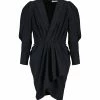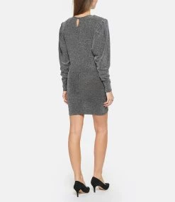 Robe courte ornée de fils métallisés argentés. Col rond. Épaulettes. Manches longues gigot. Fermeture goutte d’eau dans le dos. Détails de fronces sur l’épaule gauche et sur la jupe. Coupe buste ample. Coupe jupe près du corps. Base asymétrique. Doublée.
