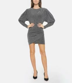 Robe courte ornée de fils métallisés argentés. Col rond. Épaulettes. Manches longues gigot. Fermeture goutte d’eau dans le dos. Détails de fronces sur l’épaule gauche et sur la jupe. Coupe buste ample. Coupe jupe près du corps. Base asymétrique. Doublée.