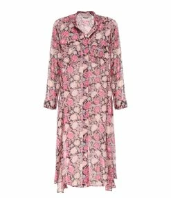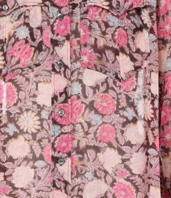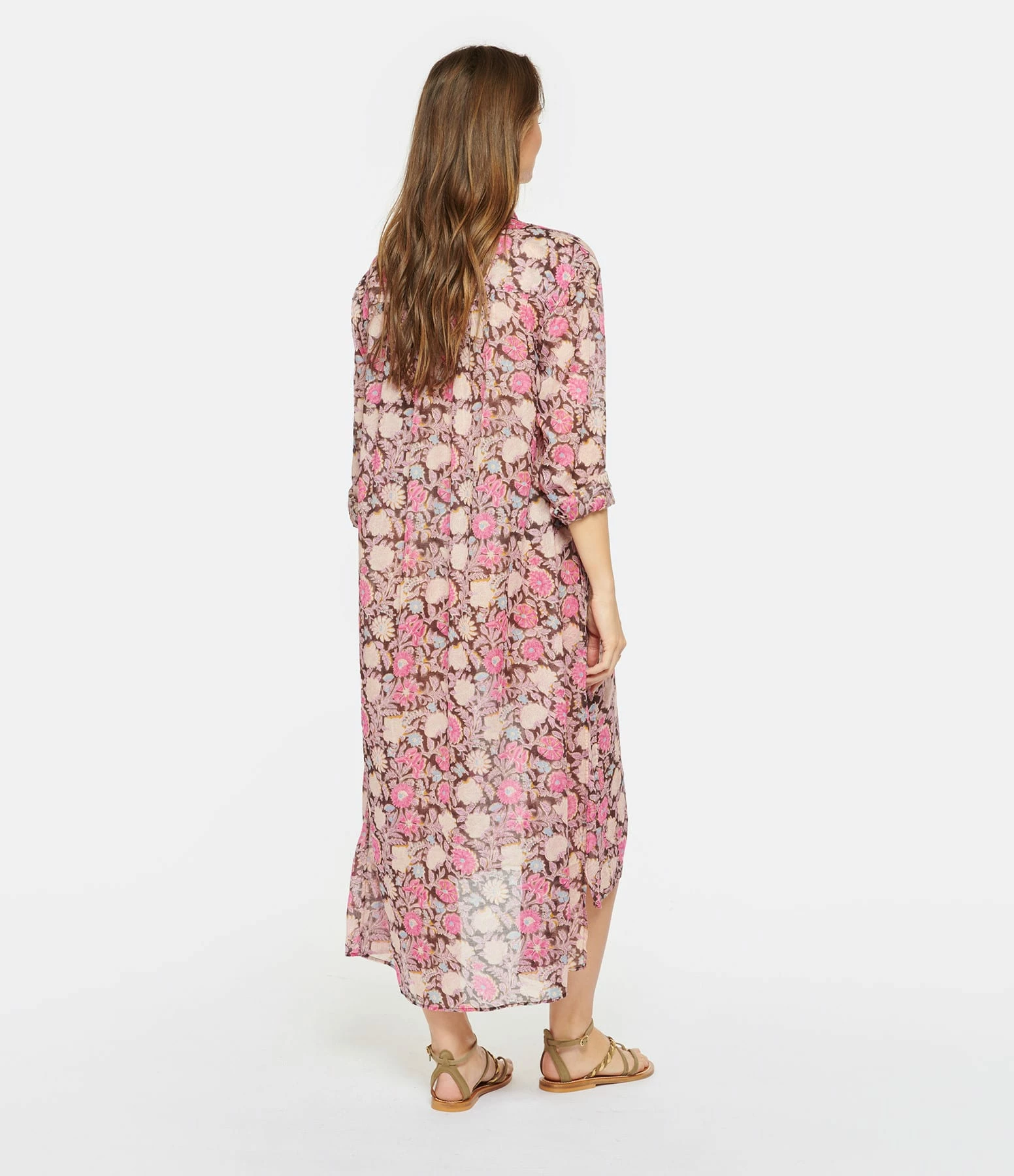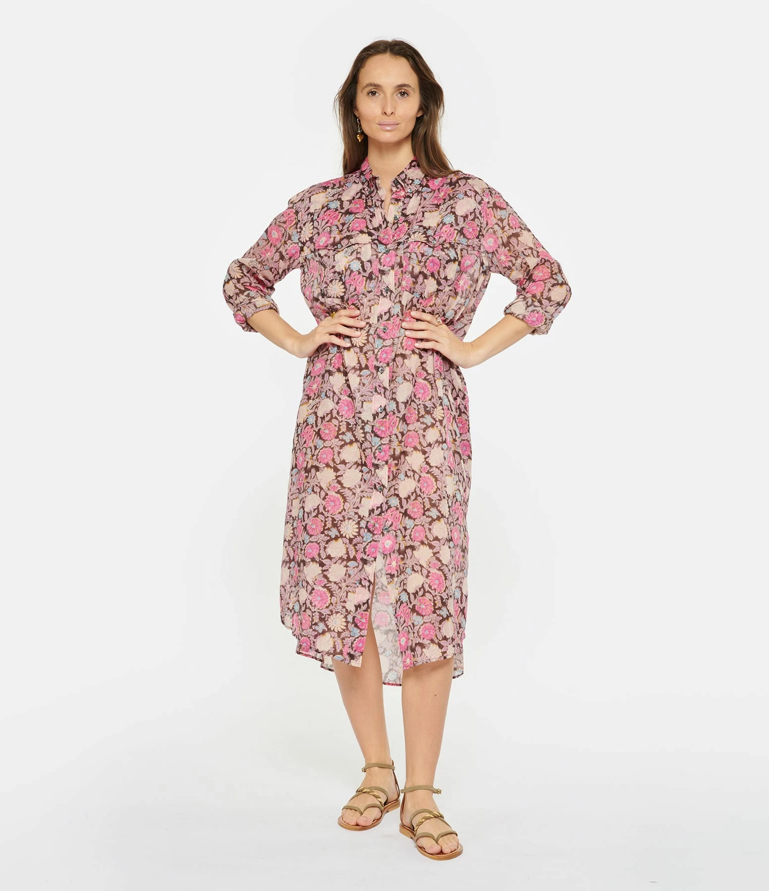 Robe longue en coton à imprimé floral multicolore. Col chemise fermé par boutons pression. Manches longues. Deux poches poitrine fermées par un bouton pression et deux poches fendues dans les coutures de côtés à l’avant. Base droite plus longue à l’arrière et fendue des deux côtés. Non doublée.