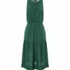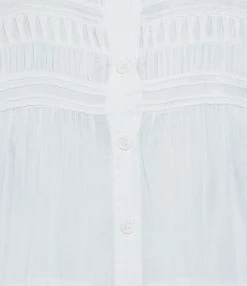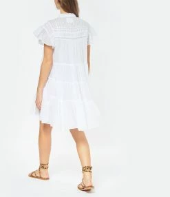 Robe courte en voile de coton blanc ornée de fronces et de volants. Col montant volanté. Manches courtes. Fermeture boutonnée sur le devant. Coupe droite. Base droite. Doublée d’un fond de robe.