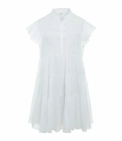 Robe courte en voile de coton blanc ornée de fronces et de volants. Col montant volanté. Manches courtes. Fermeture boutonnée sur le devant. Coupe droite. Base droite. Doublée d’un fond de robe.