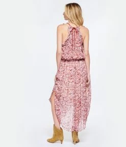 Robe longue à imprimé framboise. Sans manches avec bords à volants et cordon de serrage à nouer dans la nuque. Col en V. Taille ajustable avec cordon de serrage à nouer sur le devant. Coupe ample. Base asymétrique volantée.