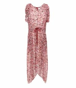 Robe longue à imprimé framboise. Sans manches avec bords à volants et cordon de serrage à nouer dans la nuque. Col en V. Taille ajustable avec cordon de serrage à nouer sur le devant. Coupe ample. Base asymétrique volantée.