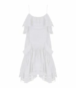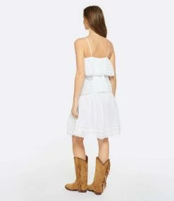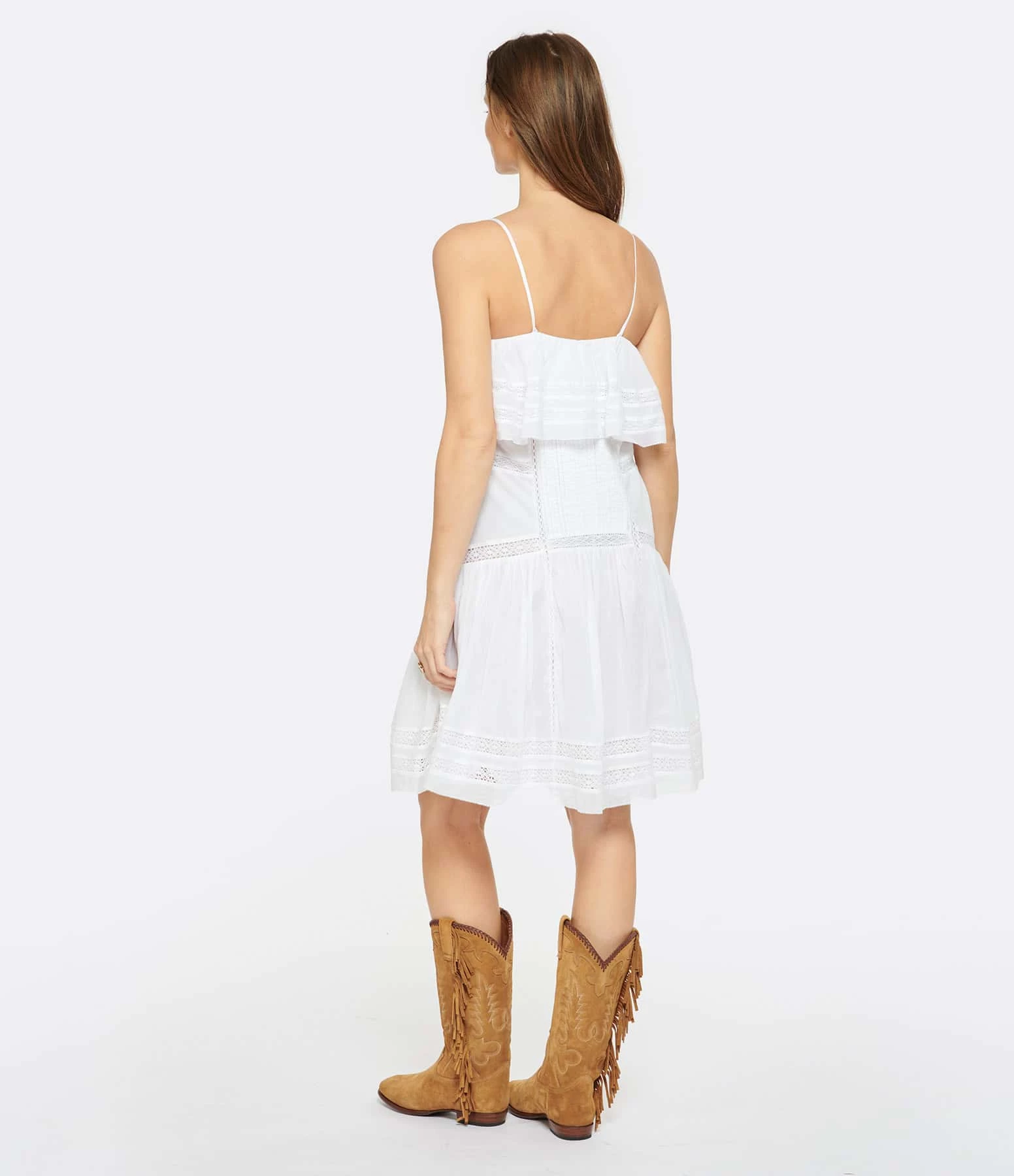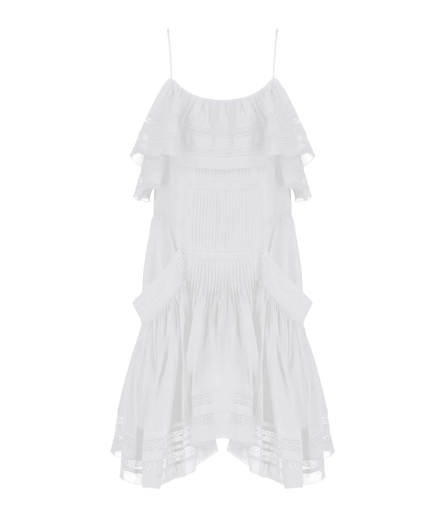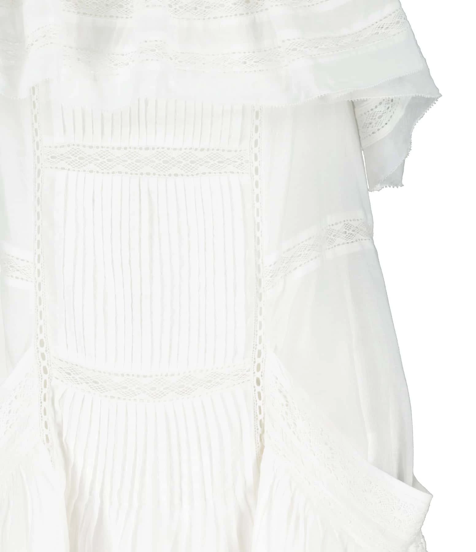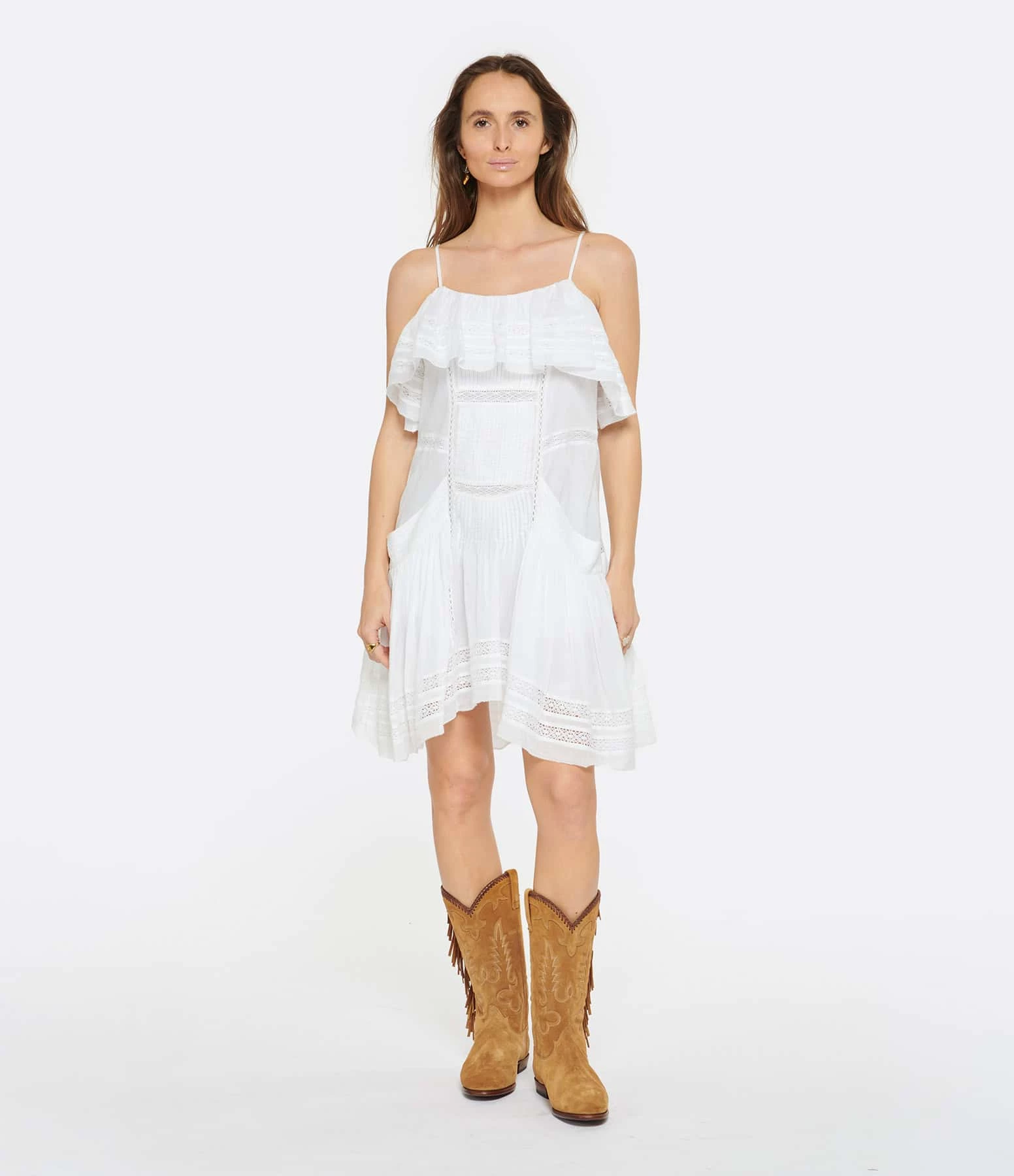Robe courte en coton blanc ornée de fronces et de volants. Coupe évasée. Base à volants.