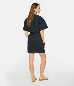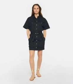 Robe en coton noir délavé à manches courtes. Deux poches passepoilées au niveau de la poitrine. Fermeture par boutons métalliques sur le devant. Col officier avec boutons métalliques. Deux poches raglans. Ceinture à boutons au niveau de la taille. Coupe droite. Base droite.