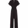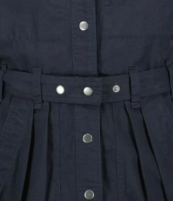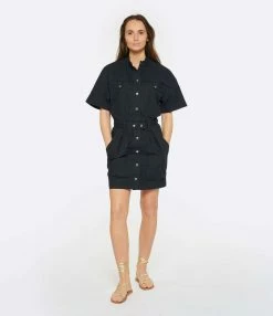 Robe en coton noir délavé à manches courtes. Deux poches passepoilées au niveau de la poitrine. Fermeture par boutons métalliques sur le devant. Col officier avec boutons métalliques. Deux poches raglans. Ceinture à boutons au niveau de la taille. Coupe droite. Base droite.