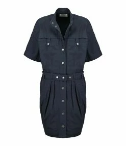 Robe en coton noir délavé à manches courtes. Deux poches passepoilées au niveau de la poitrine. Fermeture par boutons métalliques sur le devant. Col officier avec boutons métalliques. Deux poches raglans. Ceinture à boutons au niveau de la taille. Coupe droite. Base droite.