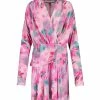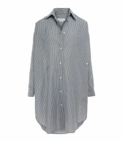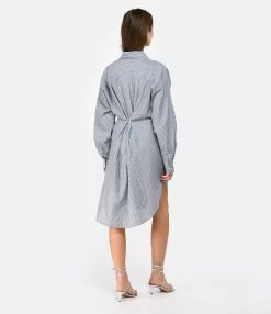 Robe chemise oversize en coton à rayures bleues et blanches. Col chemise à revers. Manches longues fermées par boutons. Possibilité de la resserrer à la taille par un bouton. Patte de boutonnage à l’avant. Base arrondie.