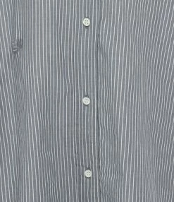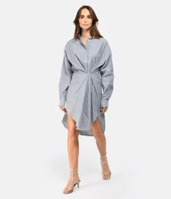 Robe chemise oversize en coton à rayures bleues et blanches. Col chemise à revers. Manches longues fermées par boutons. Possibilité de la resserrer à la taille par un bouton. Patte de boutonnage à l’avant. Base arrondie.