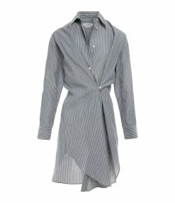 Robe chemise oversize en coton à rayures bleues et blanches. Col chemise à revers. Manches longues fermées par boutons. Possibilité de la resserrer à la taille par un bouton. Patte de boutonnage à l’avant. Base arrondie.