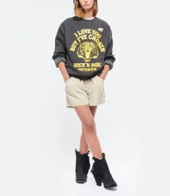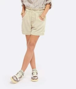 Short en coton écru. Taille haute élastiquée. Deux poches italiennes. Deux poches plaquées au dos. Fermeture zippée avec bouton. Coupe droite. Base droite.