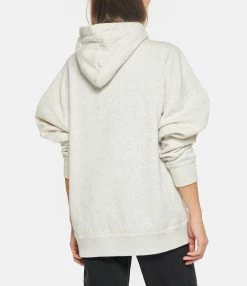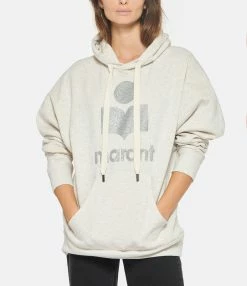 Sweatshirt en coton molletonné écru. Col rond à capuche avec liens de resserrage. Logo “Marant” flocké en paillettes argentées. Manches longues avec poignet côtelé. Poche kangourou sur le devant. Coupe ample. Base droite côtelée.