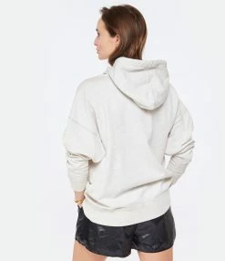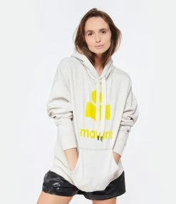 Sweatshirt en coton molletonné écru. Logo “Marant” en velours jaune sur le devant. Col rond à capuche avec liens de resserrage. Manches longues avec poignet côtelé. Poche kangourou sur le devant. Coupe ample. Base droite côtelée.