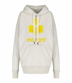 Sweatshirt en coton molletonné écru. Logo “Marant” en velours jaune sur le devant. Col rond à capuche avec liens de resserrage. Manches longues avec poignet côtelé. Poche kangourou sur le devant. Coupe ample. Base droite côtelée.