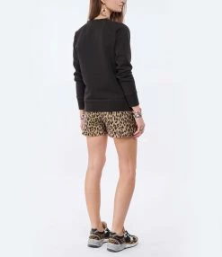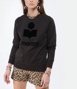 Sweatshirt en coton noir délavé avec logo “Marant” en velours noir. Col rond. Manches longues. Base et poignets resserrés par bords côtes. Coupe droite, base droite.