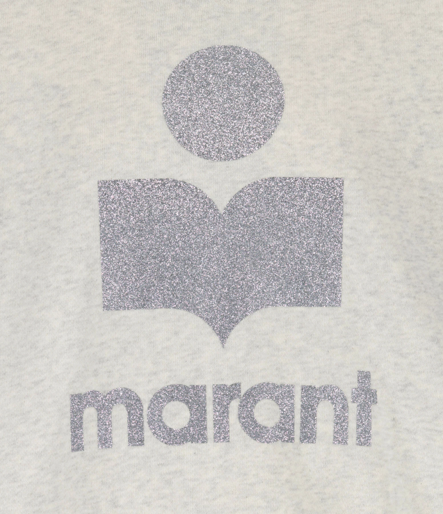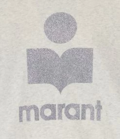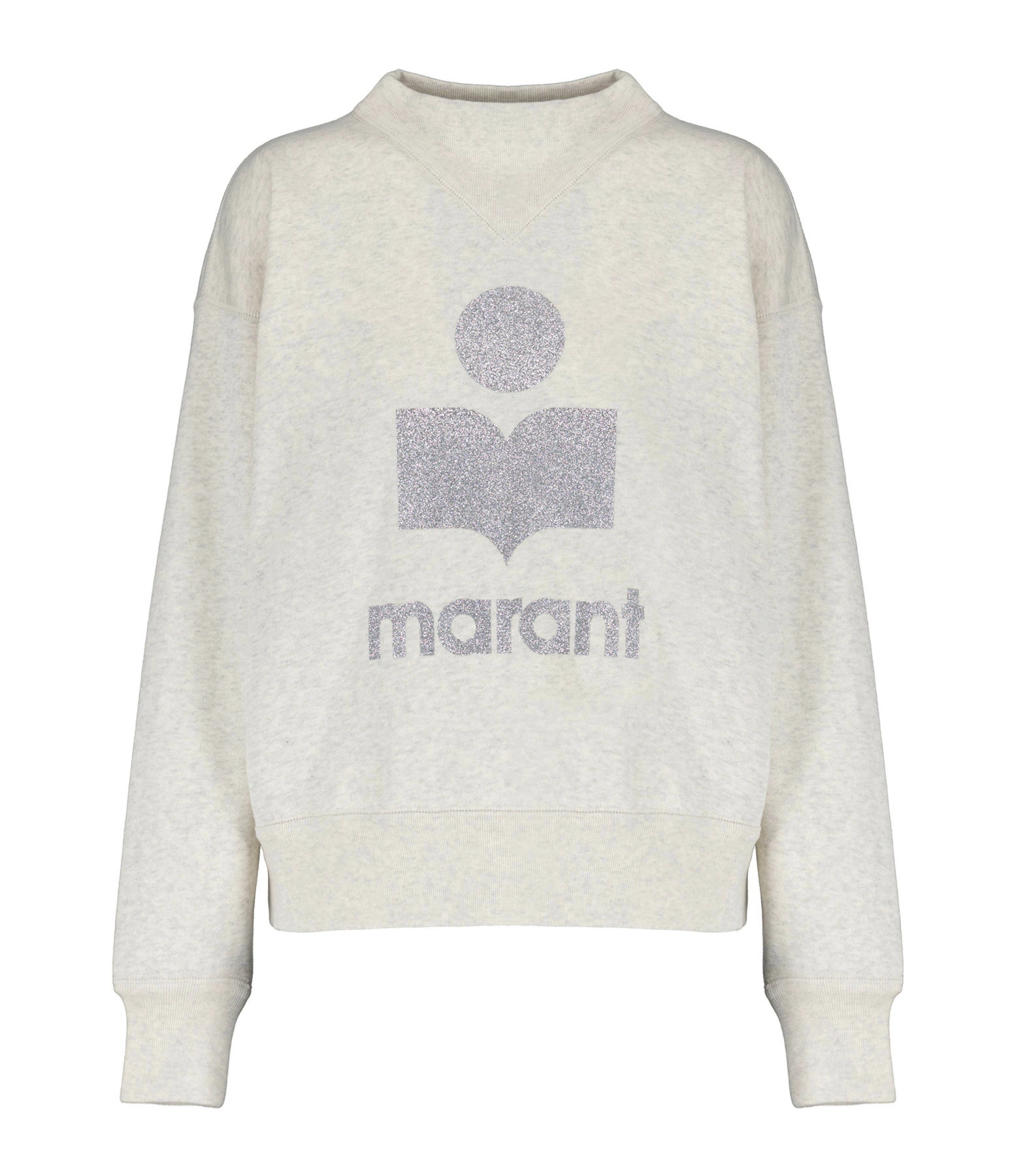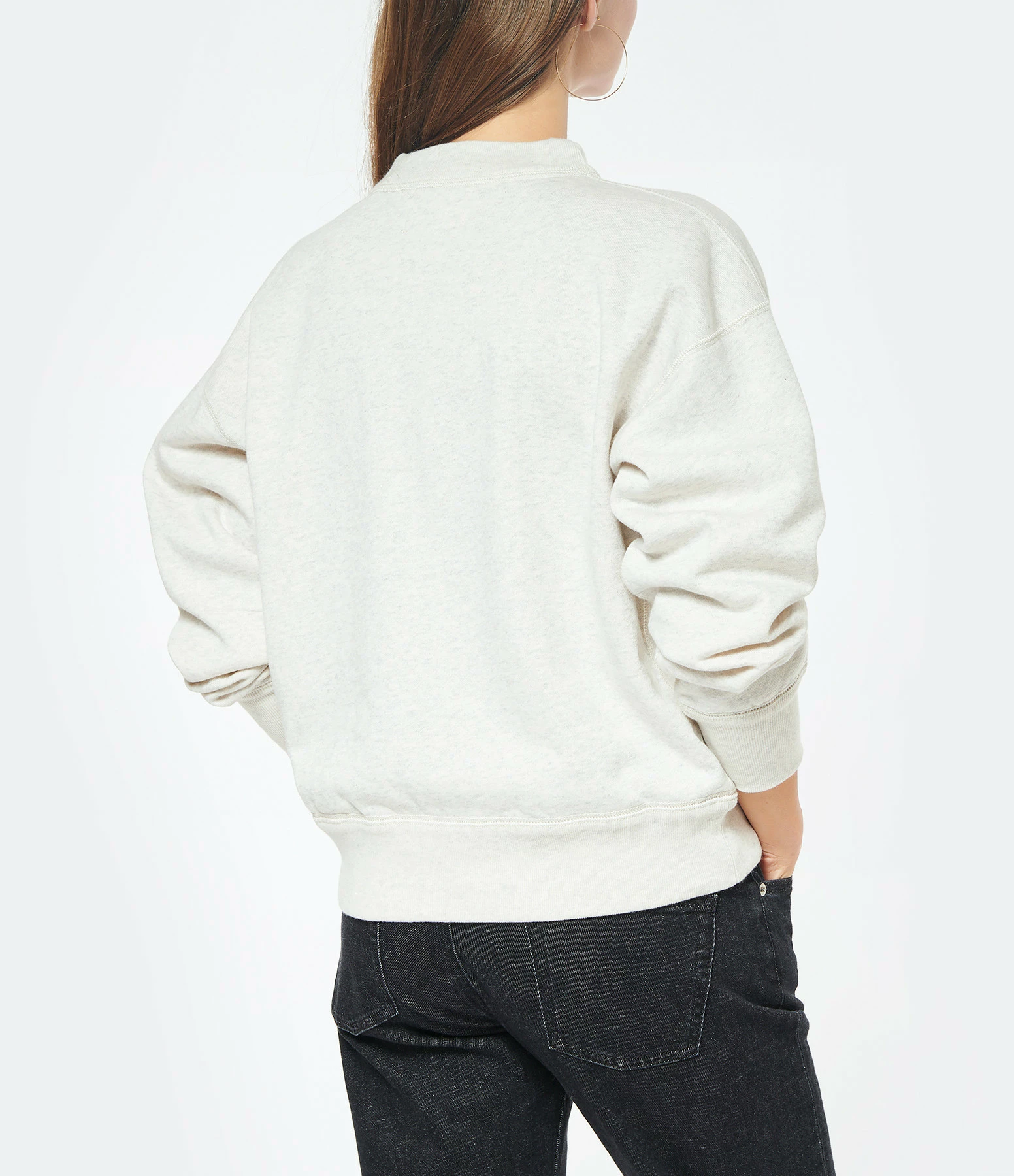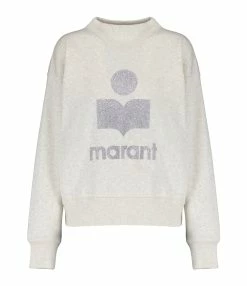 Sweatshirt en coton molletonné mélangé beige. Logo en flocage paillette argenté sur le devant. Col montant côtelé. Manches longues avec poignets côtelés. Coupe droite. Base droite côtelée.