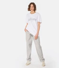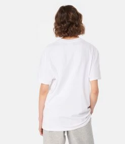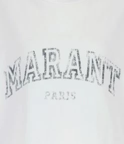 Tee-shirt en coton blanc avec l’inscription “Marant Paris” imprimée en noir avec un effet effacé et usé sur le devant. Col rond côtelé. Manches courtes. Coupe droite. Base droite.
