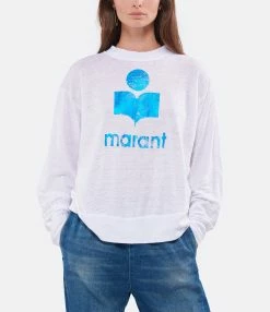Tee-shirt en lin blanc. Logo “Isabel Marant” bleu métallisé. Col rond. Manches longues. Coupe droite. Base droite.