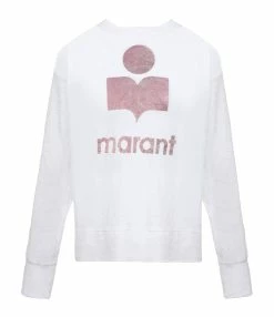 Tee-shirt en lin blanc. Logo “Isabel Marant” rose métallisé. Col rond. Manches longues. Coupe droite. Base droite.