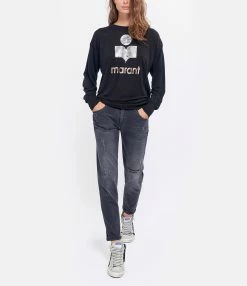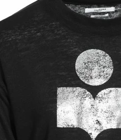 Tee-shirt en lin noir. Logo “Isabel Marant” argenté et rose gold floqué à l’avant. Col rond. Manches longues. Coupe droite. Base droite.